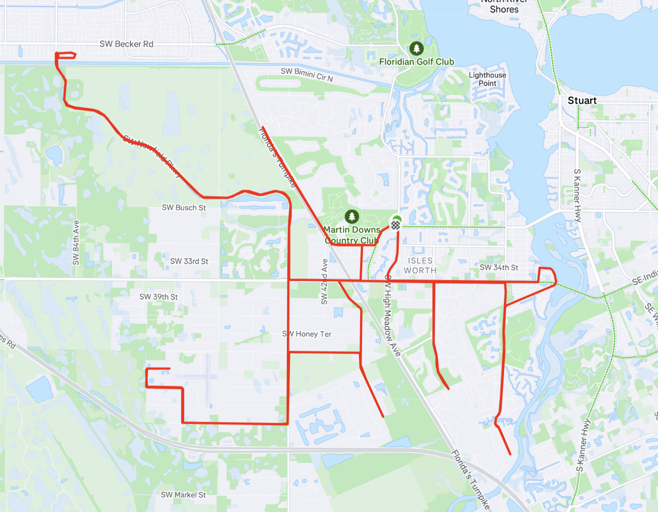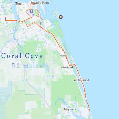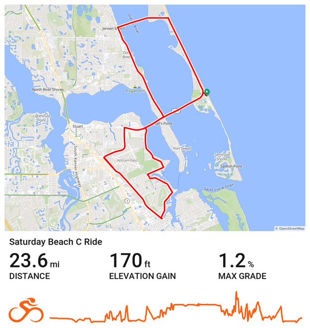This ride will take you into "The Hills" of Jensen Beach via Savannah Rd or the beaches. Multiple laps in the hills can be accomplished if desired. Average distance 30 miles. Average pace 15-17mph pace. B and C riders are wend Back or lcome as we all join up at the end.